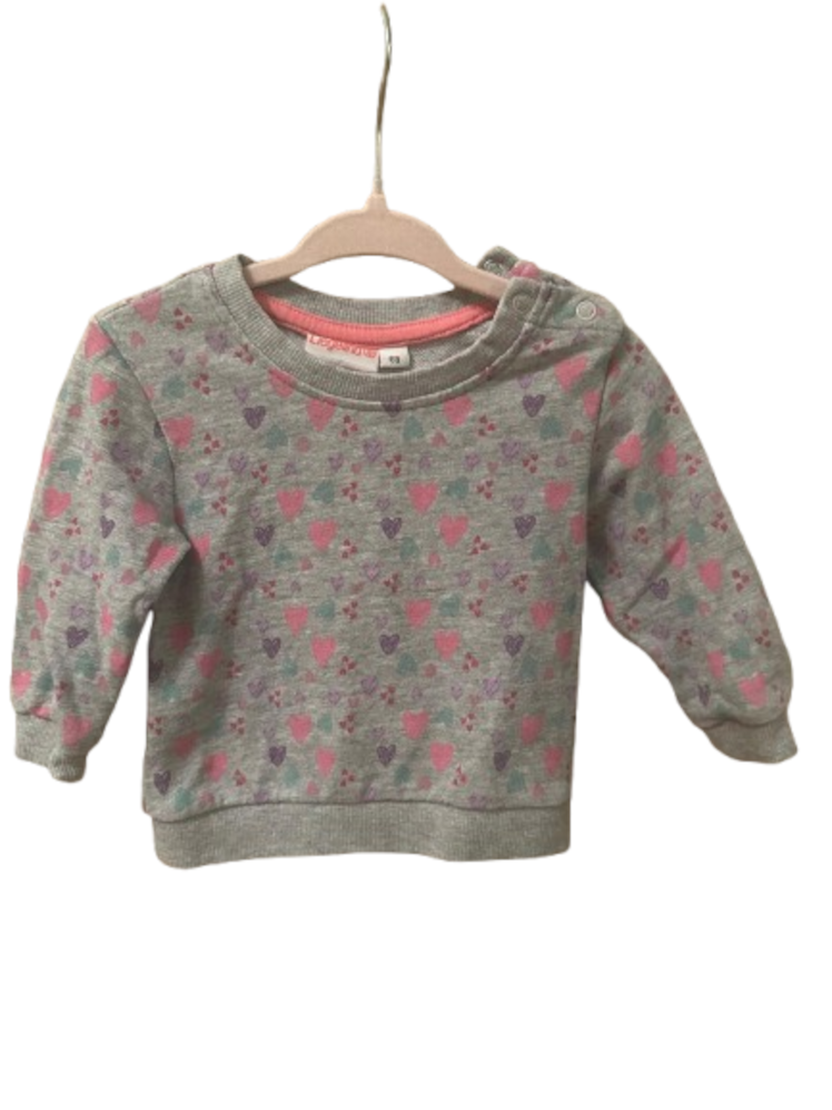 Grauer Langarm-Sweatshirt für Babys oder Kleinkinder mit einem Muster aus kleinen Herzen in verschiedenen Farben, darunter Pink, Lila und Türkis. Es hat zwei Knöpfe an der linken Schulter zum leichteren Anziehen. Das Etikett im Kragen trägt den Schriftzug "Carter's" und die Größe "18M" (18 Monate).