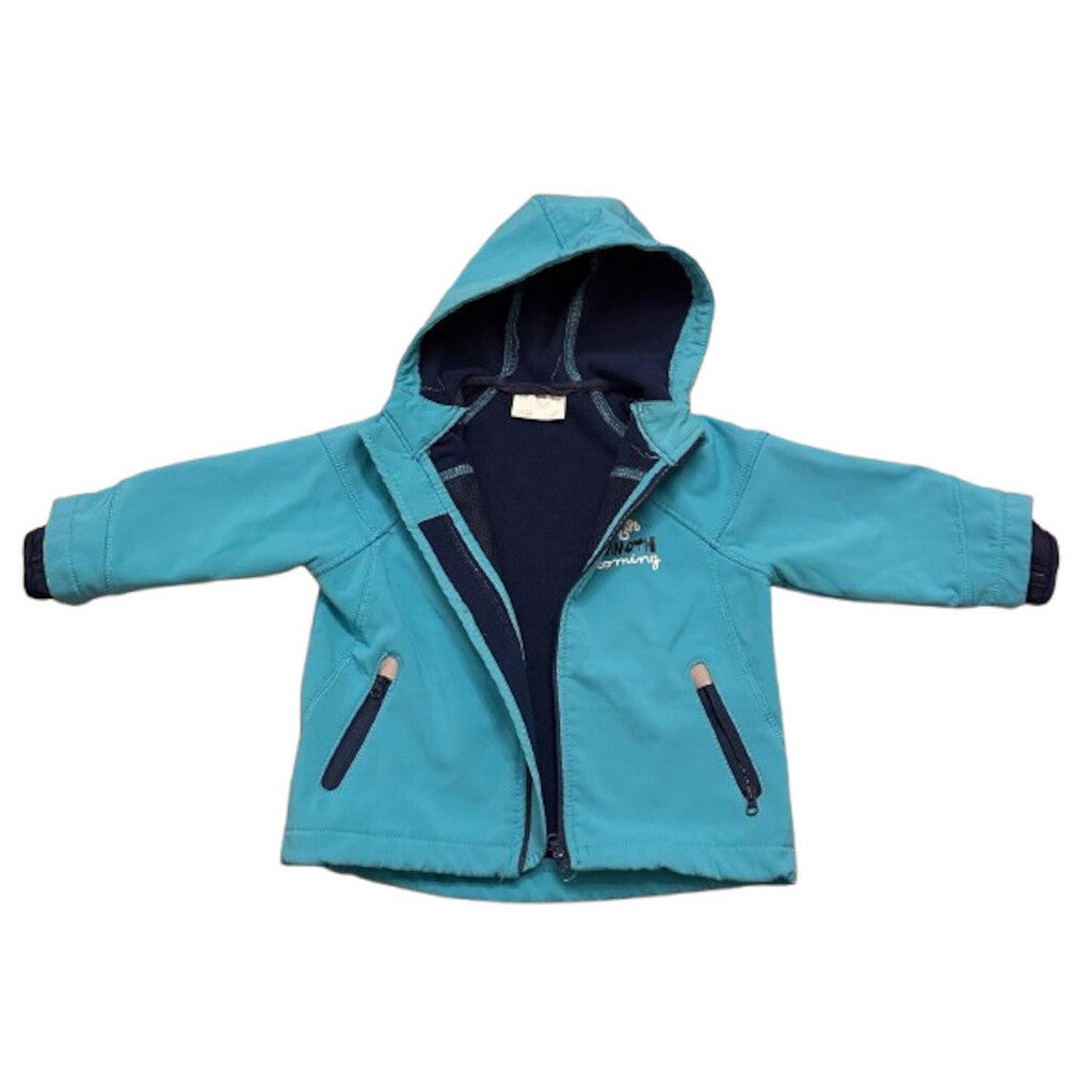 Softshell-Kinderjacke in Türkis mit Kapuze. Die Jacke hat einen Reißverschluss in der Mitte und zwei Reißverschlusstaschen auf der Vorderseite. Das Innenfutter der Jacke ist dunkelblau..